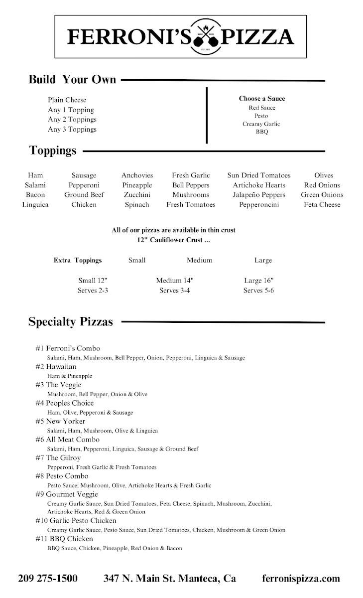 The menu at Ferroni's Pizza offers a straightforward yet satisfying selection focused on classic and specialty pizzas alongside a handful of comforting starters and snacks. Whether you're stopping in for a casual bite or ordering delivery for a relaxed evening at home, the flavors and familiar dishes create a welcoming experience.