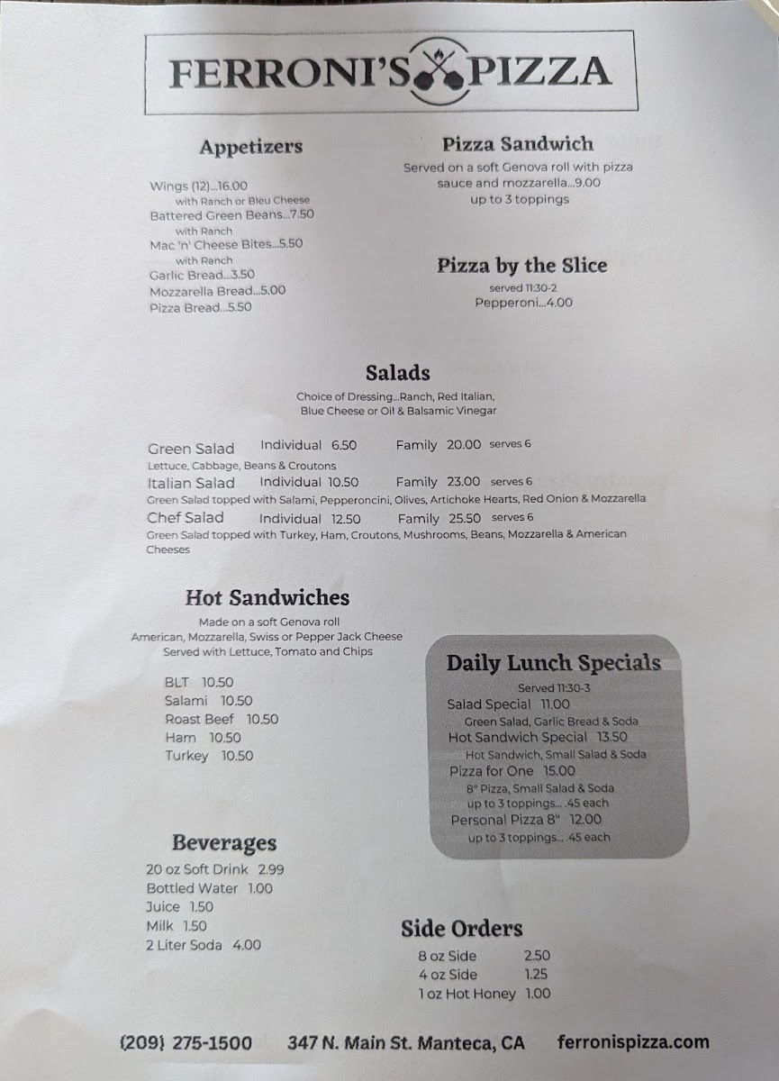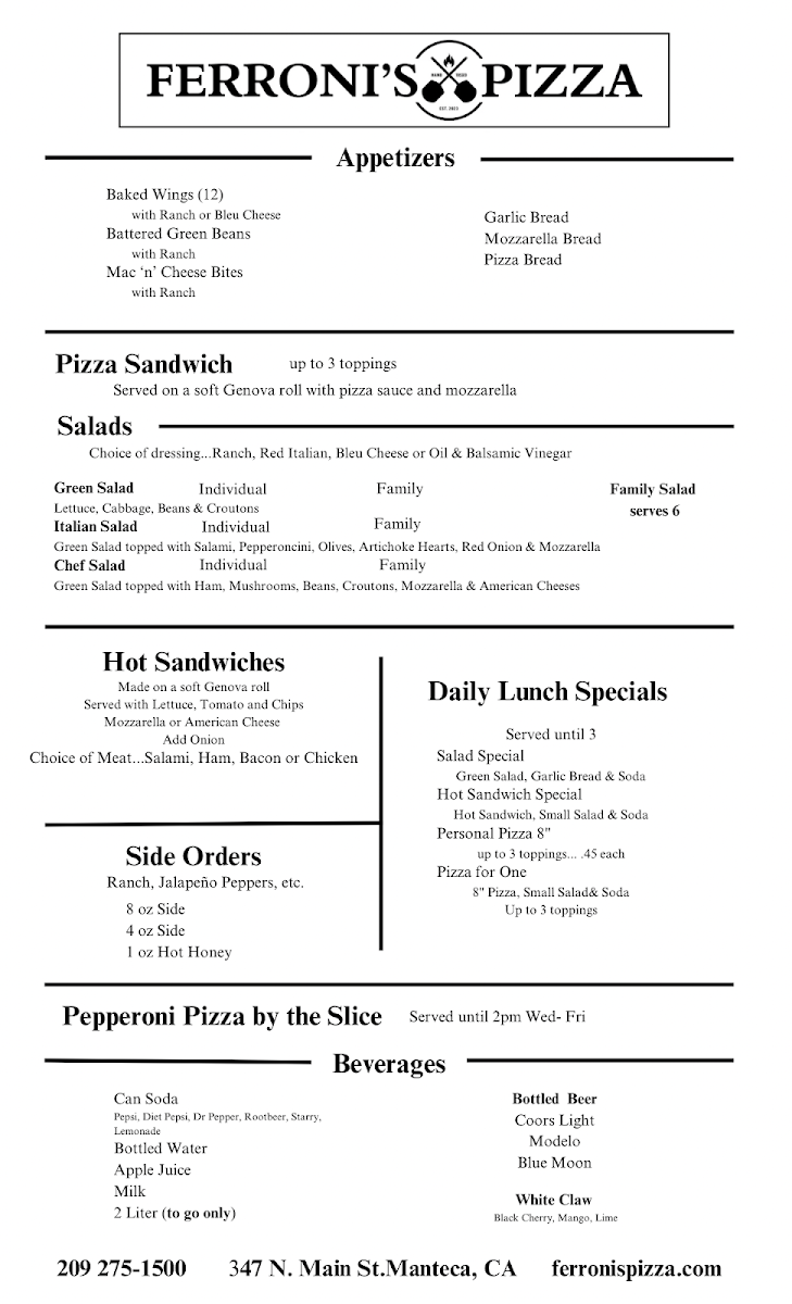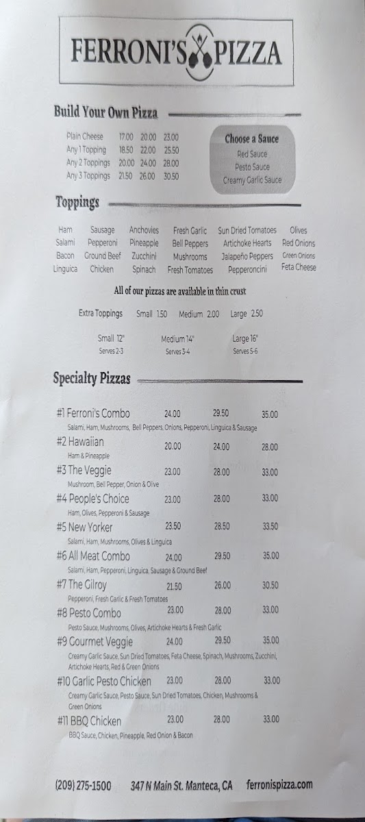 Overall, the selection reflects a classic American pizza experience with an emphasis on quality and comfort, perfectly suited to the casual and homely vibes of Ferroni’s Pizza in Manteca.